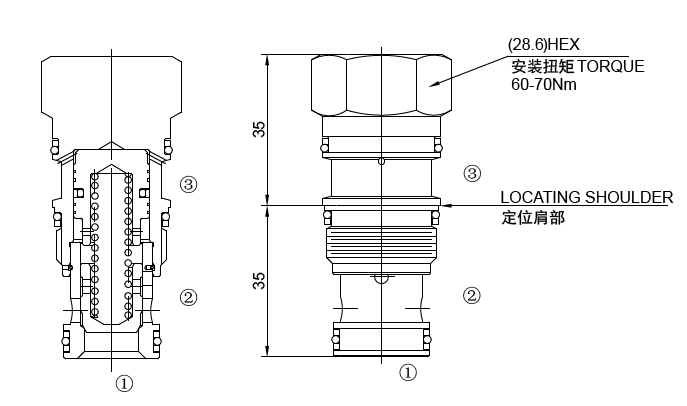 当液控口③压力达到一定时,锥阀芯关闭,①和②不通,液控活塞面积与锥阀座面积