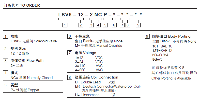 流量请查看《压力-流量曲线图》插孔12-2过滤参考《油液清洁度》最大工作压力350Bar内泄漏3 drops/min.(滴/分)max. at 350bar温度-40°F to +212°F(-40°C to +100°C)线圈额定负载Continuous from 85% to 115% of nominal voltage(连续工作电压)油液Mineral-based fluids with viscosities of 7.4 to 420 cSt.(矿物油粘度)阀块材料钢和球铁允许使用最大压力350bar -