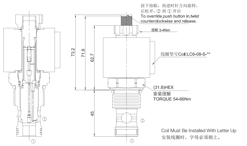 请按下按钮,再逆时针方向旋转180°,后松开,②到①开启;请按下按钮,再顺时针