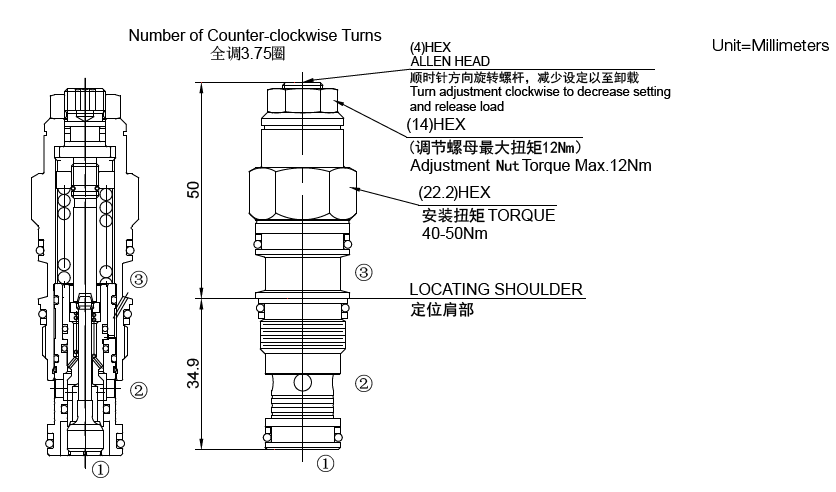 ②口的背压按“控制比 +1”的倍数加到溢流阀的设定值上即增加值 =(1+ 控制比)× 压力值。