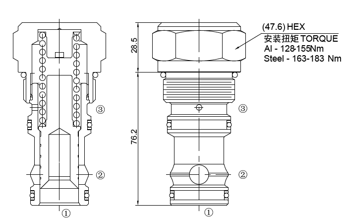 当①口的油压克服弹簧设定压力时,油液从①口到②口流动。③口压力叠加到弹簧设