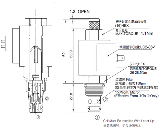 失电时,①到②相当于单向阀,②到①关闭;