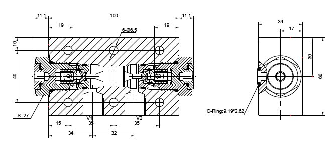 C1 到V1,C2 到V2 关闭. 在相反方向,V1 到C1, V2 到C2 打开。控制比为7:1, 所以在V1 口或V2 口的压力超过C1 口或