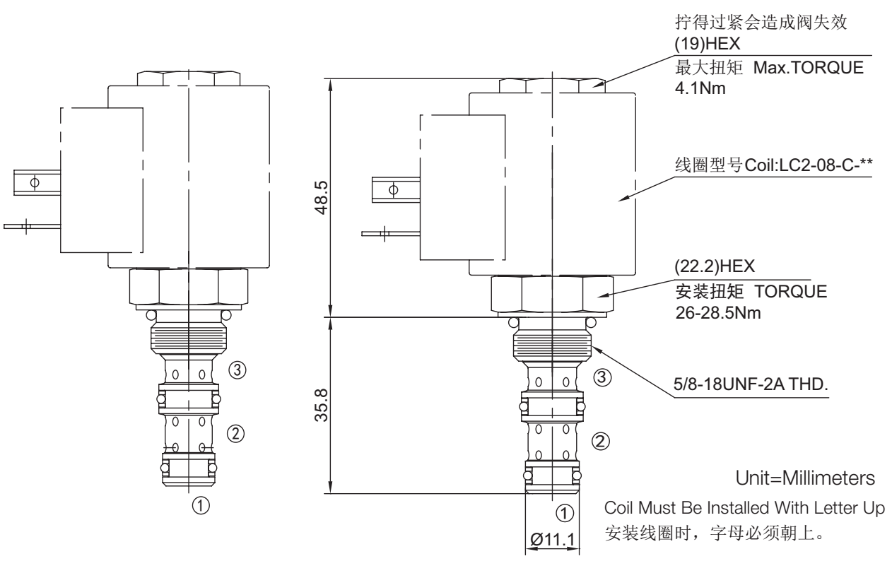 工作压力207bar流量请查看《压力-流量曲线图》插孔07-3过滤参考《油液清洁度》内泄漏82cc/min.(毫升/分)max.at 207bar温度-40ºF to +250ºF(-40ºC to +120ºC)线圈额定负载Continuous from 85% to 115% of nominal voltage(连续工作电压)油液Mineral-based fluids with viscosities of 7.4 to 420 cSt.(矿物油粘度)阀块材料6061-T6铝,允许使用最大压力207bar,钢和球铁允许使用最大压力350bar -