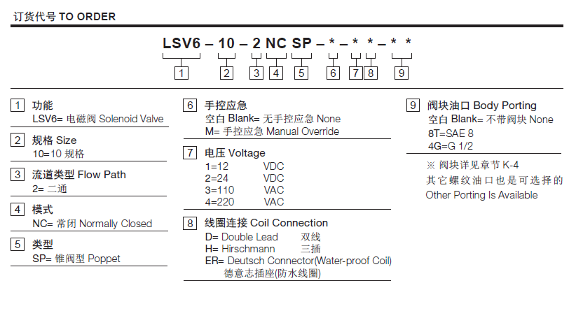 流量请查看《压力-流量曲线图》插孔10-2过滤参考《油液清洁度》最大工作压力350Bar内泄漏5 drops/min.(滴/分) max. at 350 bar温度-40°F to +212°F(-40°C to +100°C)线圈额定负载Continuous from 85% to 115% of nominal voltage(连续工作电压)油液Mineral-based fluids with viscosities of 7.4 to 420 cSt.(矿物油粘度)阀块材料钢和球铁允许使用最大压力350bar -