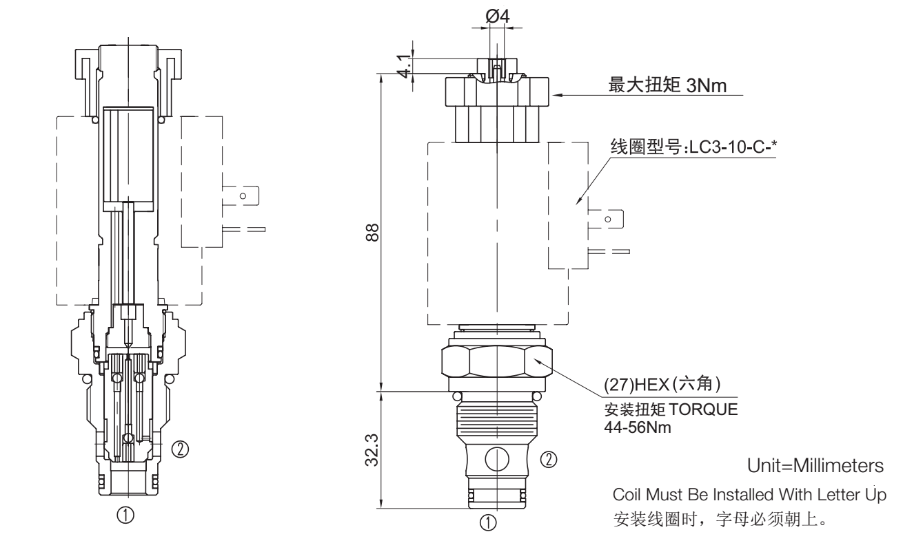 流量请查看《压力-流量曲线图》插孔10-2过滤参考《油液清洁度》最大工作压力350Bar内泄漏5drops/min.(滴/分) max. at 350 bar温度-40°F to +212°F(-40°C to +100°C)线圈额定负载Continuous from 85% to 115% of nominal voltage(连续工作电压)阀块材料钢和球铁允许使用最大压力350bar -